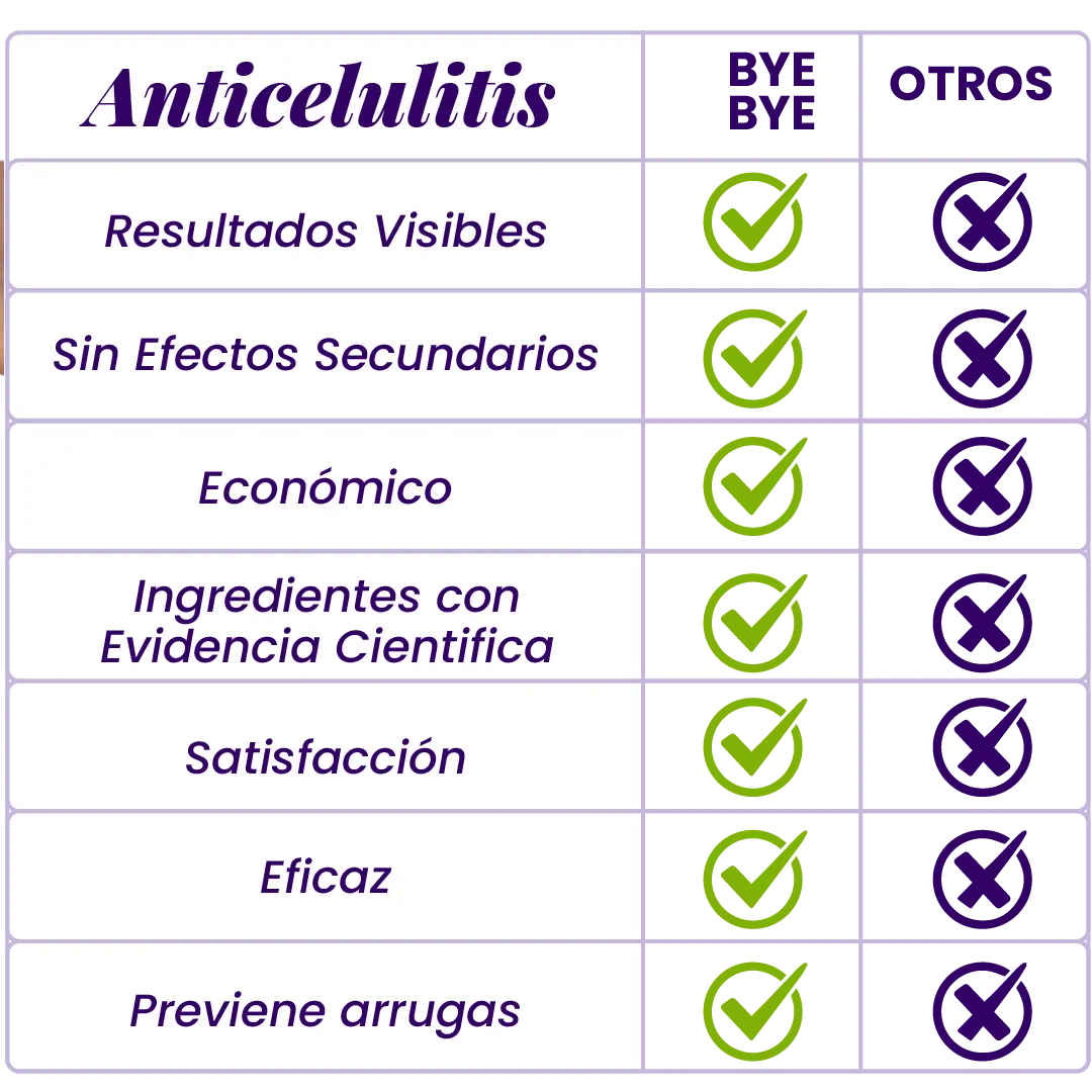 Bye Bye Celulitis te ofrece una solución efectiva para combatir la celulitis en solo dos semanas. Nuestra fórmula única y natural trabaja intensamente para reducir la apariencia de la celulitis, eliminar líquidos retenidos y tonificar tu piel. No más esperas interminables, empieza a disfrutar de una piel firme y hermosa ahora mismo. ¡Haz clic para transformar tu piel!